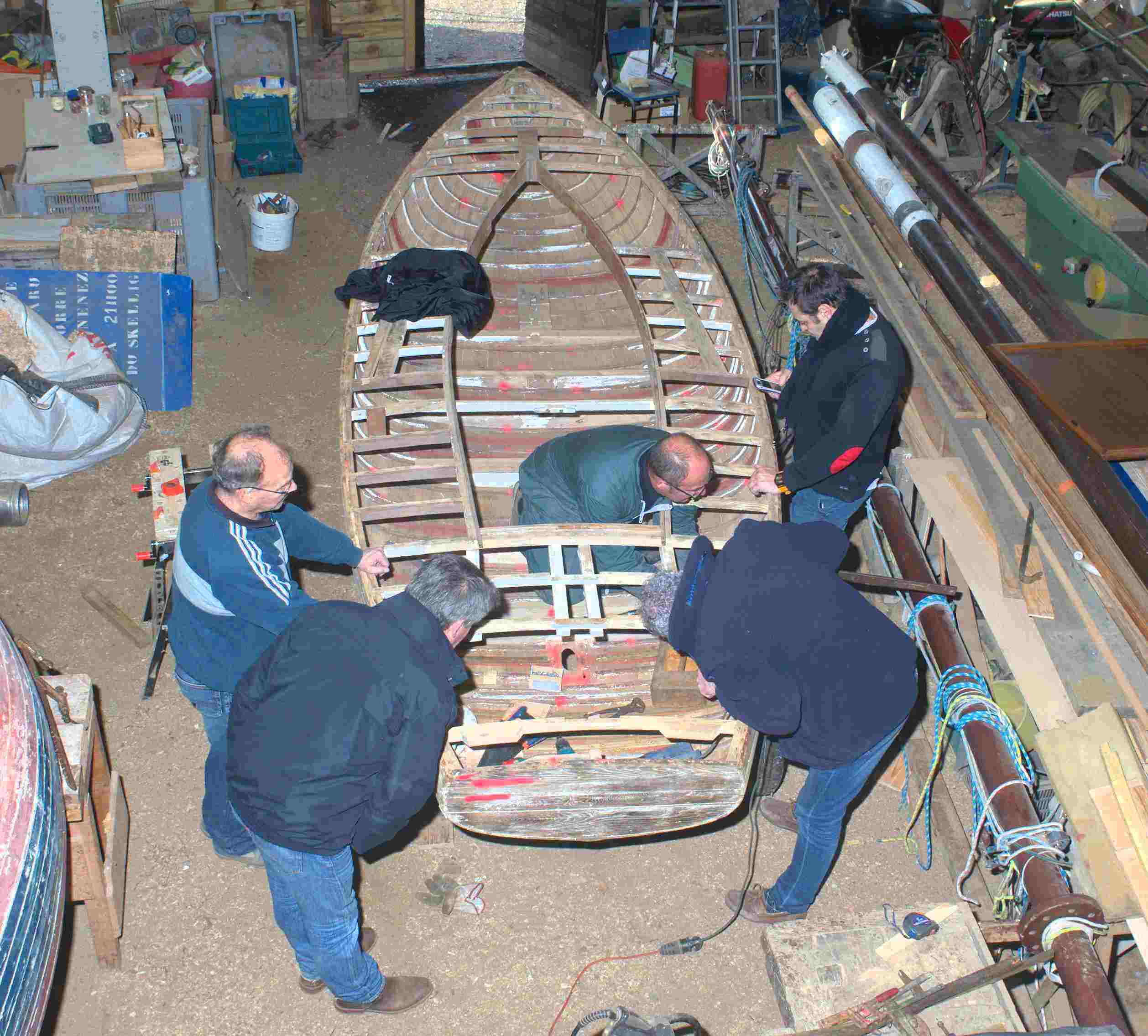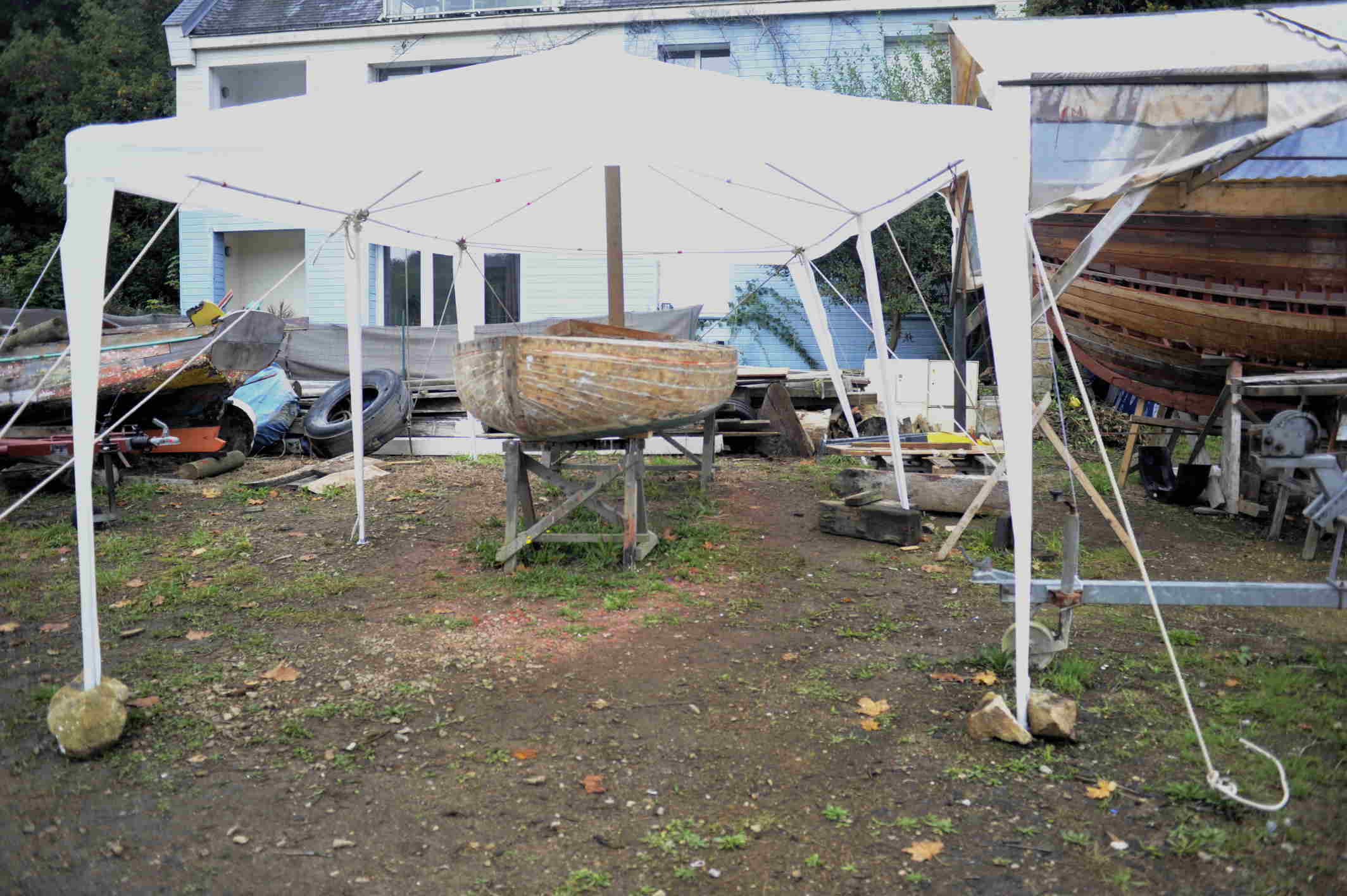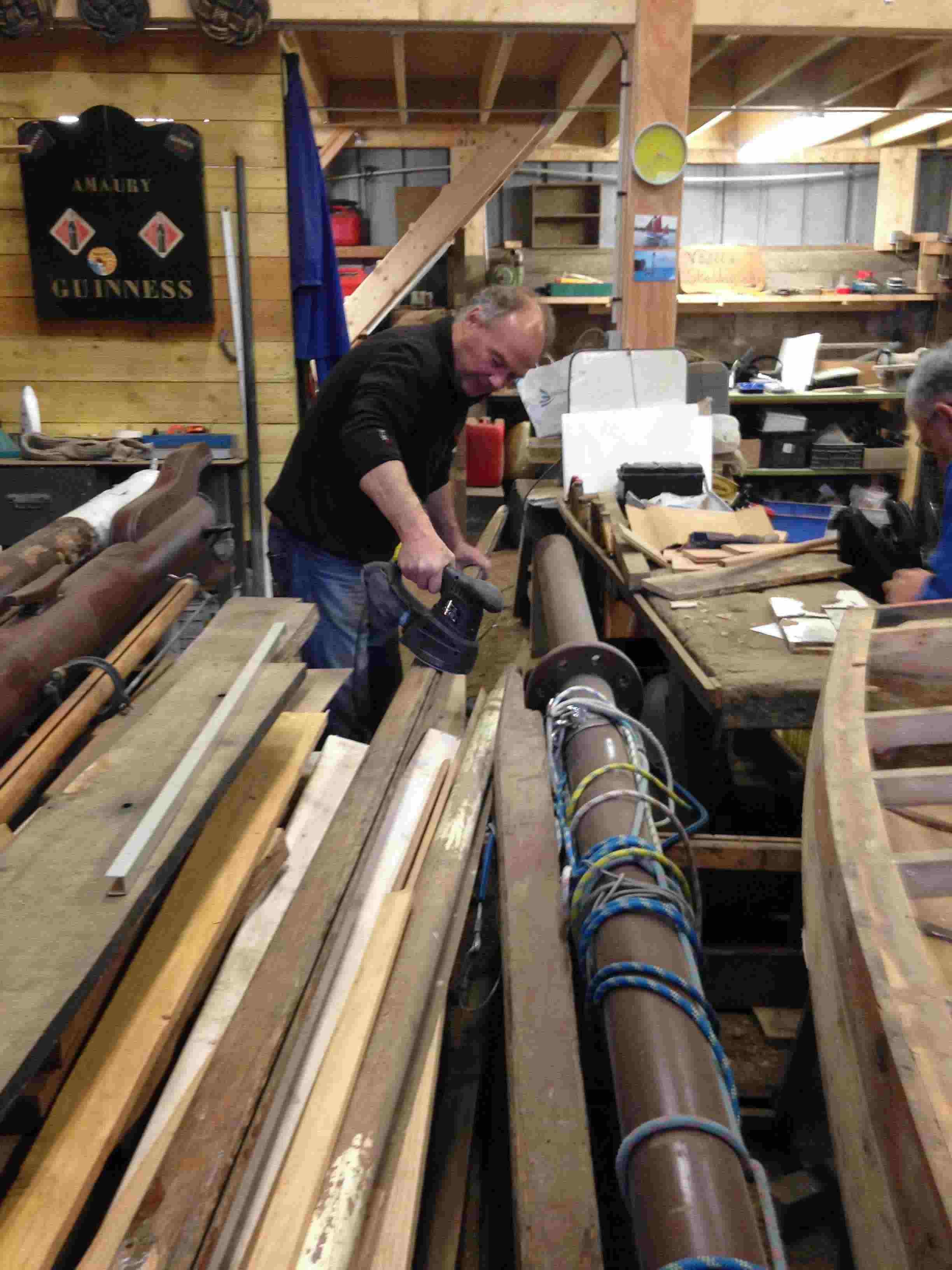 Après avoir mis la coque à nu nous avons pu constater que son état général était meilleur que ce que laissait supposer nos premiers examens de la carène. L'association Skellig nous a permis de rentrer Kaz Rouz dans son atelier où nous bénéficions d'un plus grand confort pour travailler.