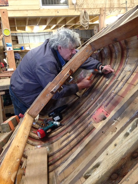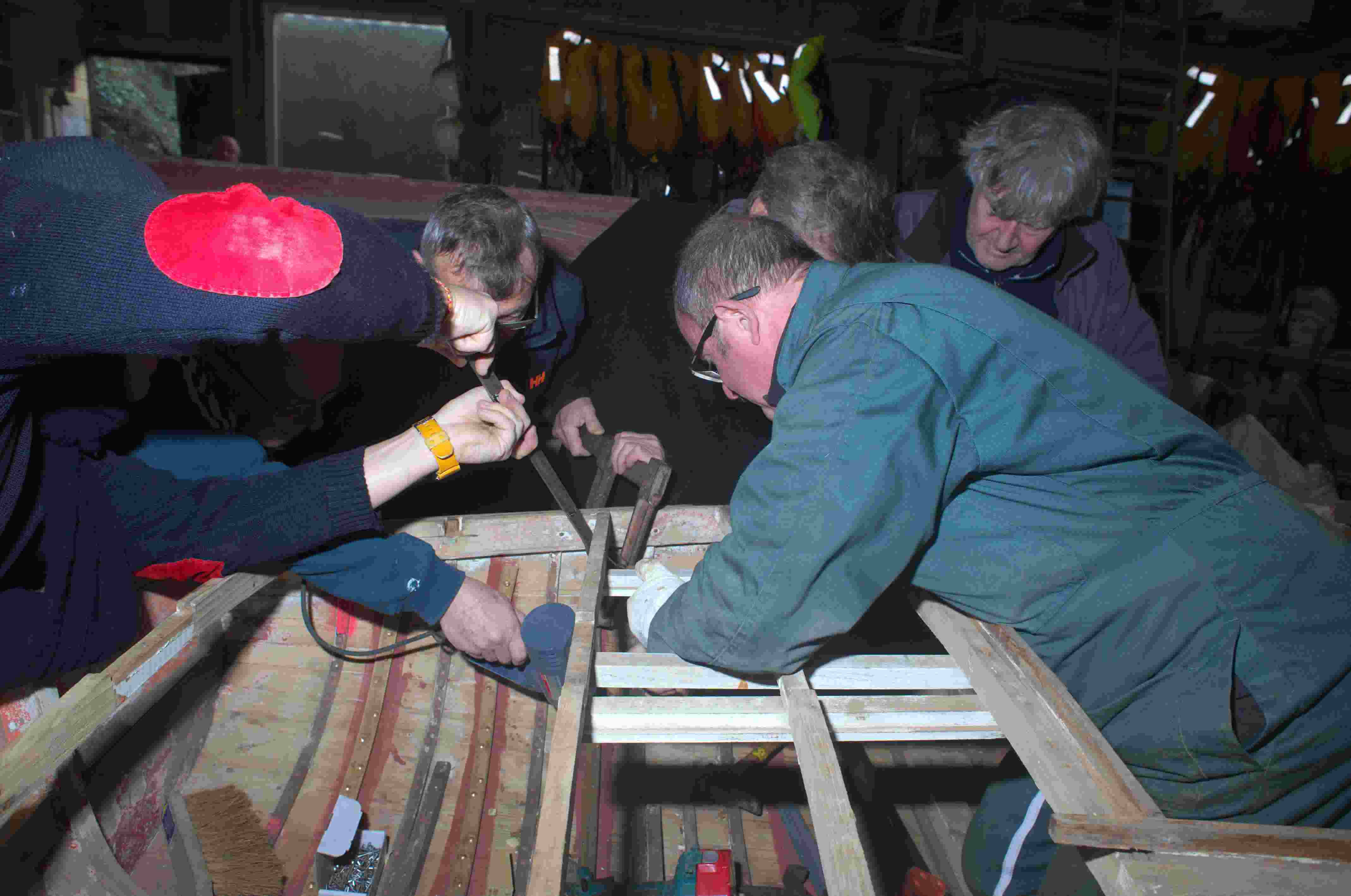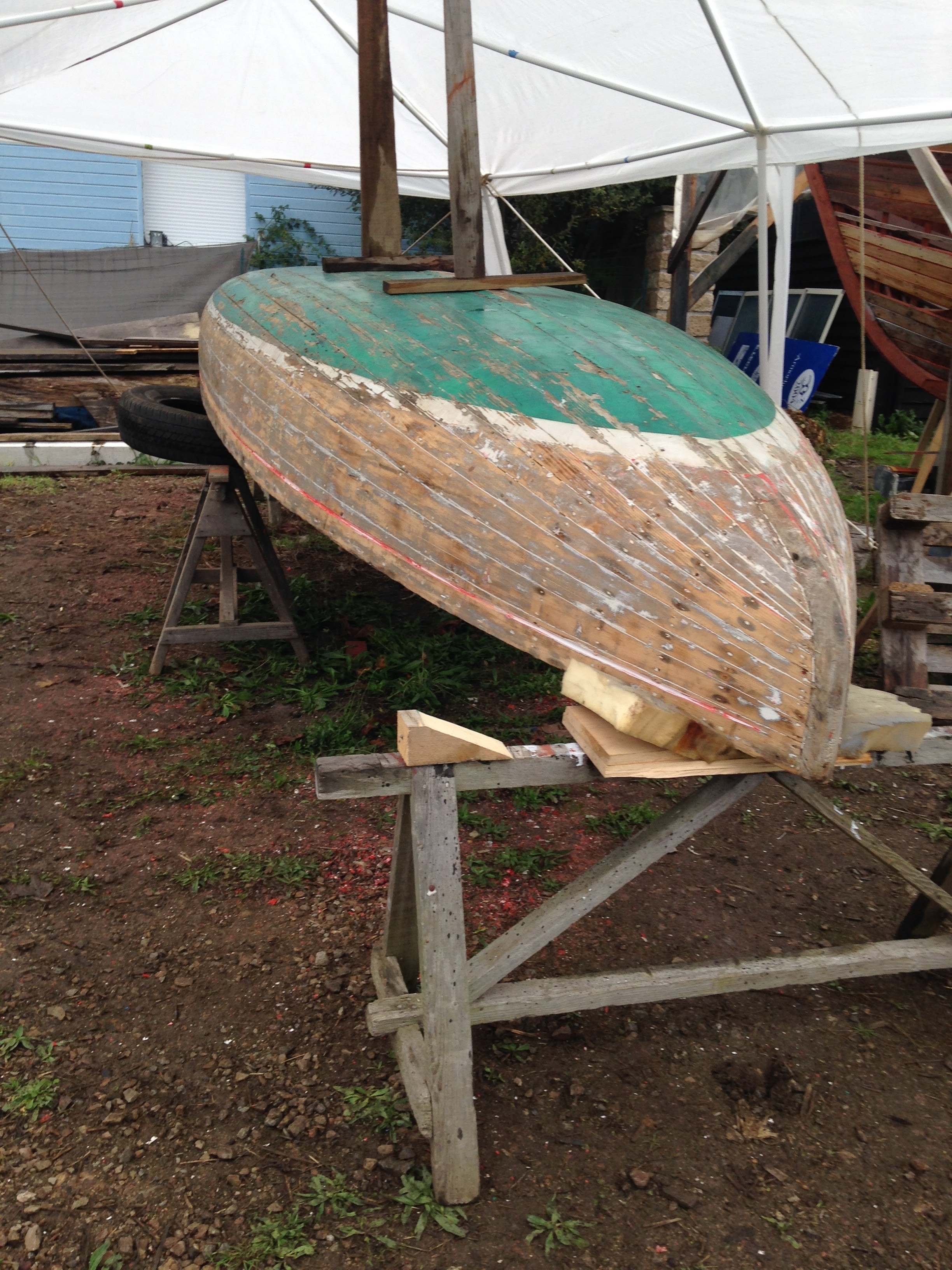 Après avoir mis la coque à nu nous avons pu constater que son état général était meilleur que ce que laissait supposer nos premiers examens de la carène. L'association Skellig nous a permis de rentrer Kaz Rouz dans son atelier où nous bénéficions d'un plus grand confort pour travailler.