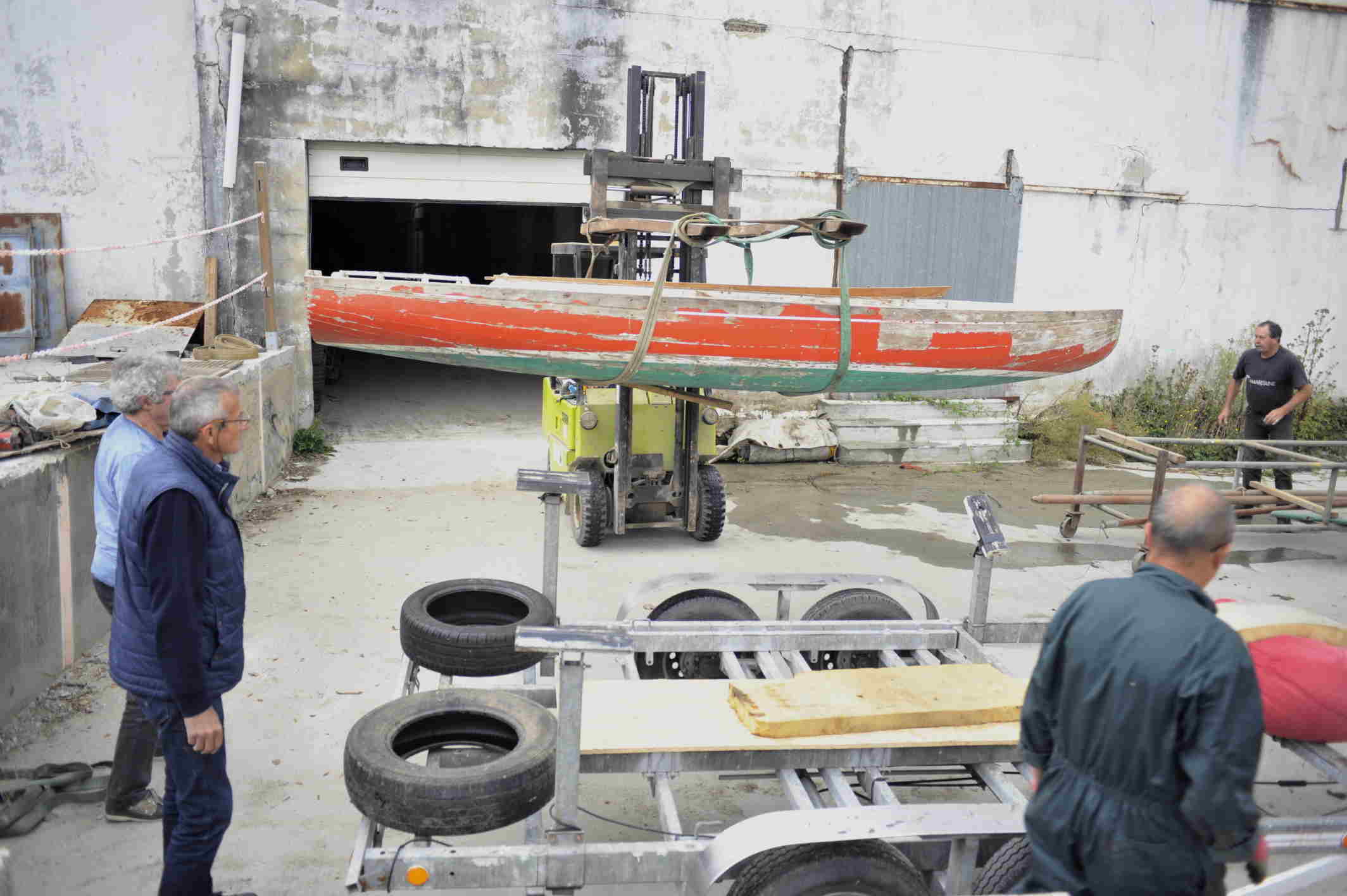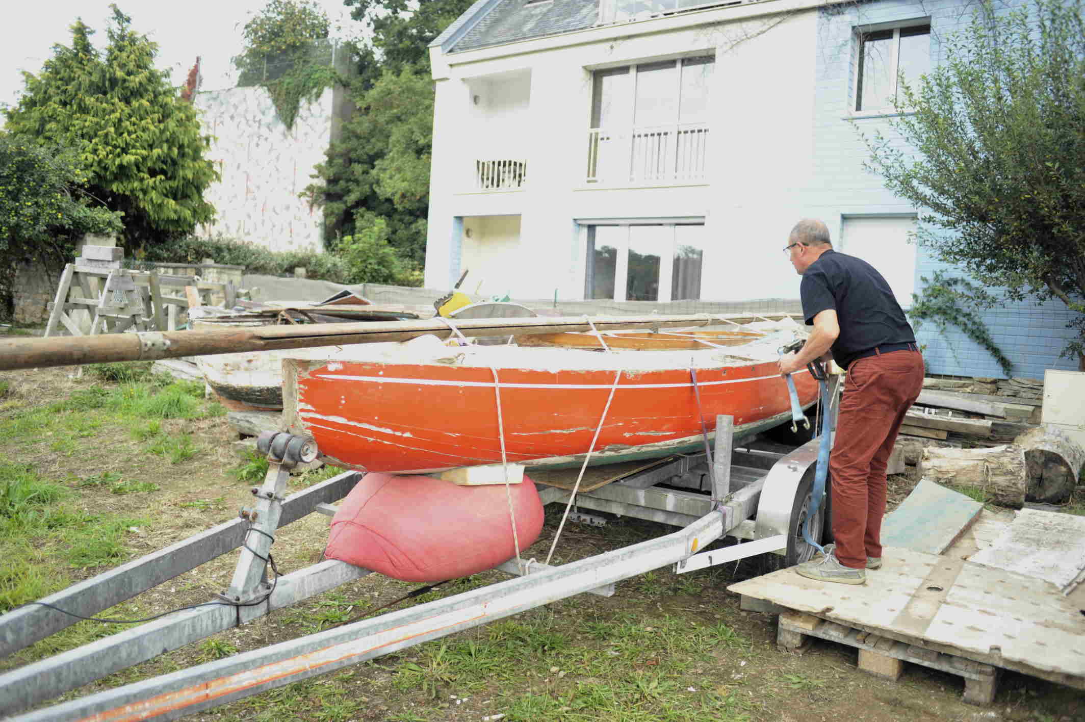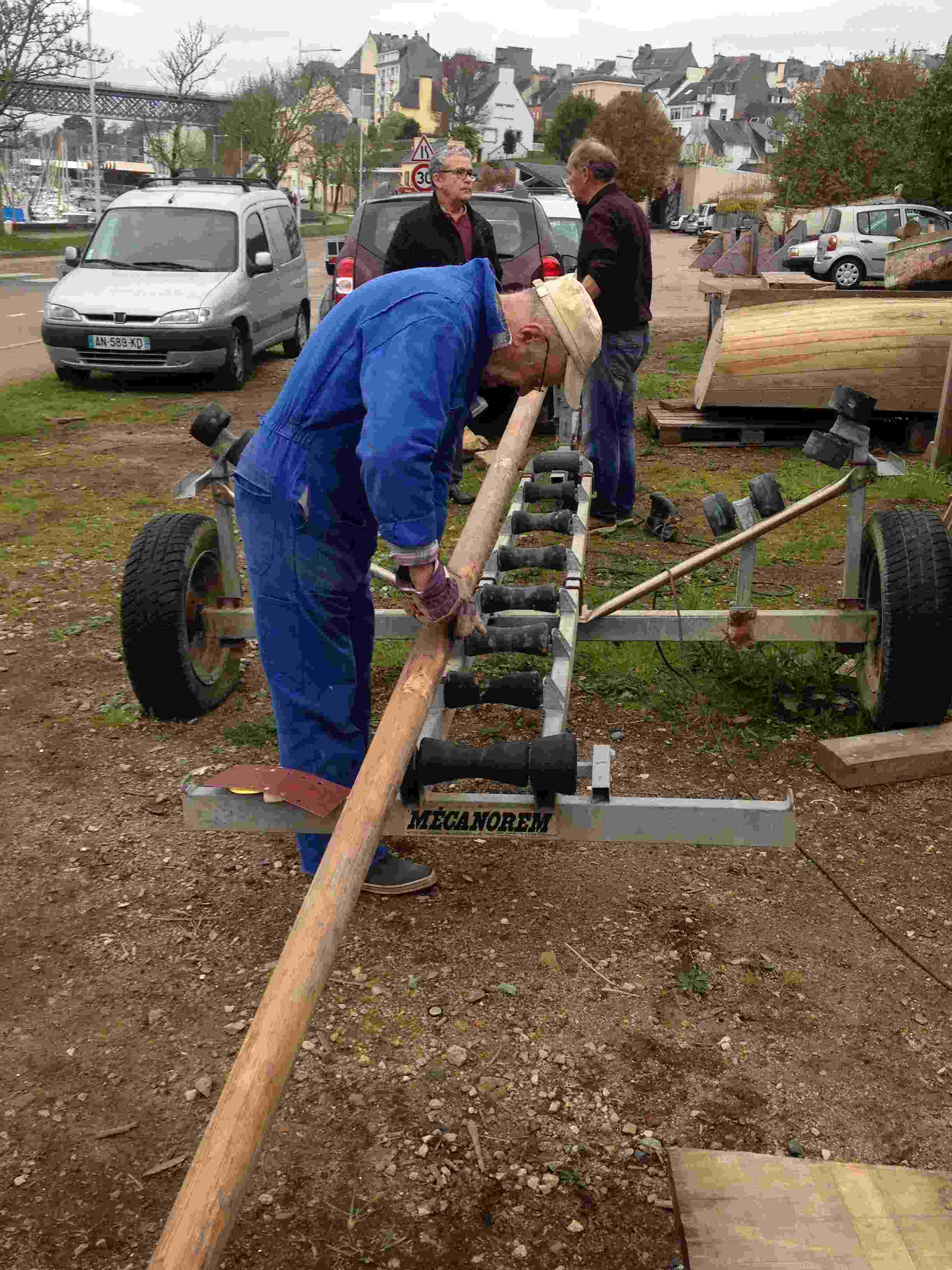 Nous sommes allés à Riec chercher Kaz Rouz le 7 septembre. Ce dernier étant sur un ber roulant il fallut tout d'abord l'installer sur la remorque de Didier ce qui fut rapidement fait grâce à nos amis de l'association de la Belle Angèle. Arrivée à Douarnenez nous l'avons dans un premier temps laissé sur sa remorque devant les locaux de Skellig.